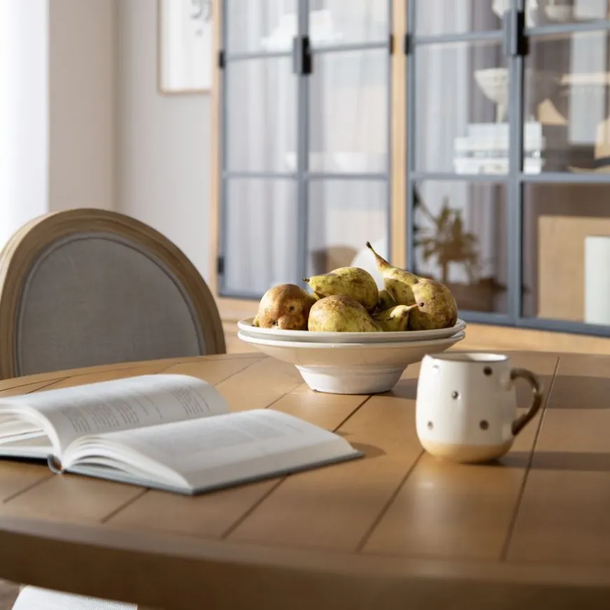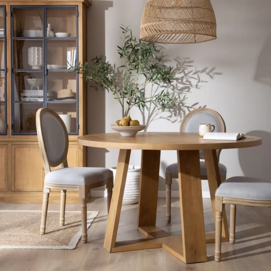 La table ronde Amaia de 130 cm de diamètre est l’un de nos modèles les plus polyvalents. Entièrement réalisée en bois fini de couleur naturelle et pouvant accueillir jusqu’à 6 personnes, cette pièce d’inspiration nordique et au design exclusif deviendra votre choix idéal pour habiller votre salle à manger ou votre cuisine. Ses pieds en bois, également légèrement inclinés, créent une belle structure qui se croise à la base, formant une belle croix au sol. La magnifique finition naturelle du bois fait du modèle Amaia le meuble idéal pour les amateurs de matériaux naturels. Enfin, si vous recherchez une vitrine pour l’associer à cette belle table et compléter la décoration de votre salle à manger, jetez un il à notre vitrine Parma. Vous l’adorerez ! La collection Parma est fabriquée artisanalement à partir de bois de manguier, un type de bois très résistant et apprécié en raison de la grande variété de tons et de veines visibles qu’il offre, pouvant varier dans une même pièce et d’une pièce à l’autre. Ces caractéristiques uniques offertes par le bois de manguier, associées à sa fabrication artisanale, font de chaque pièce une pièce unique. Le bois de manguier se distingue également par sa grande durabilité, car ce n’est qu’à l’âge adulte de l’arbre, lorsque sa production de fruits ralentit, qu’il devient une source parfaite de bois.