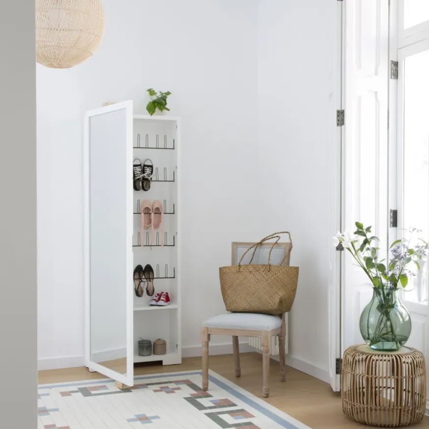 Ce meuble à chaussures étroit en bois blanc avec miroir Asue est un véritable cadeau pour décorer votre maison et garder toutes vos chaussures en ordre. Son design discret nous fait penser qu’il s’agit d’un simple miroir sur pied avec un cadre en bois blanc que nous pouvons intégrer dans n’importe quelle pièce, même à l’entrée de la maison, mais comme la plupart des choses, le meilleur est à l’intérieur ! En ouvrant la porte, vous découvrirez un pratique meuble à chaussures dans lequel vous pourrez organiser toutes vos chaussures. Vous pourrez y ranger environ 20 paires ! De plus, nous devons prêter une attention particulière à ses dimensions rationalisées : 70×24,5×190 cm. Il comprend également une étagère inférieure pour vos accessoires et 4 poignées à l’intérieur de la porte pour vos foulards ou chapeaux. Que peut-on demander de plus ? Veuillez noter que ce nombre peut varier en fonction de la taille et du volume de la chaussure.