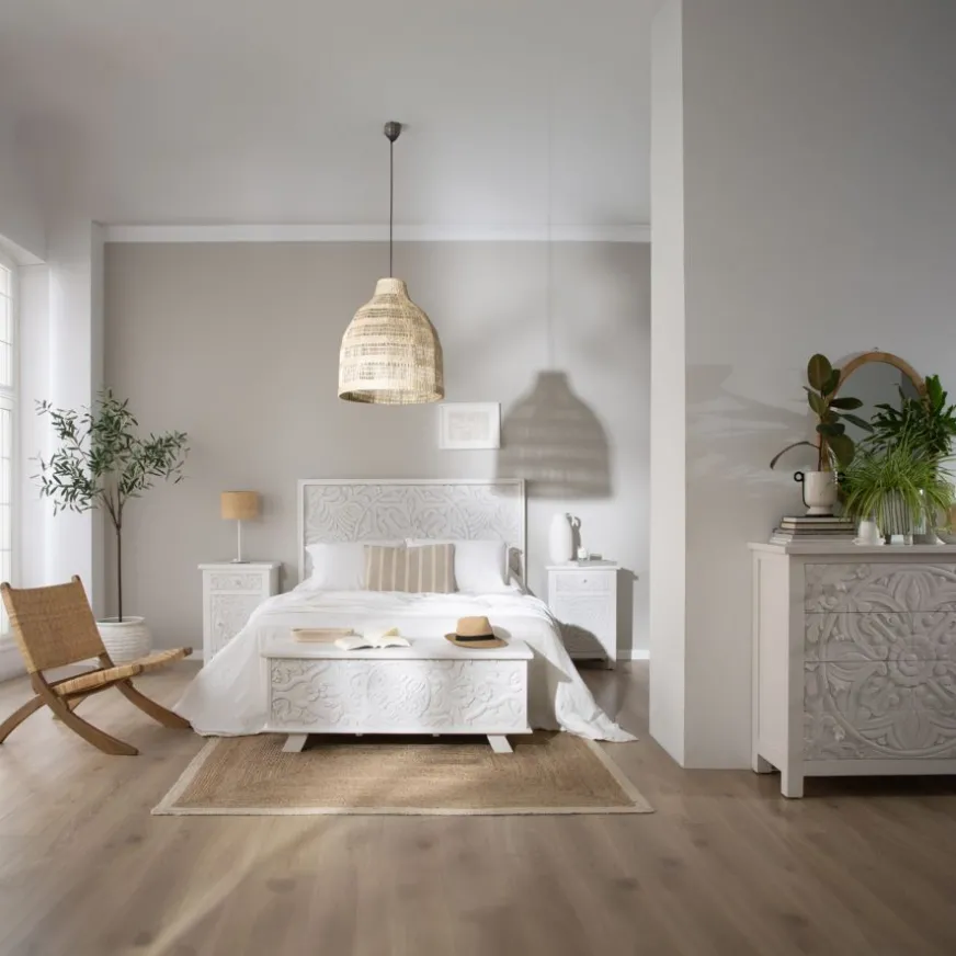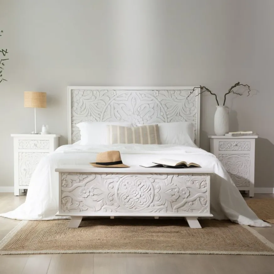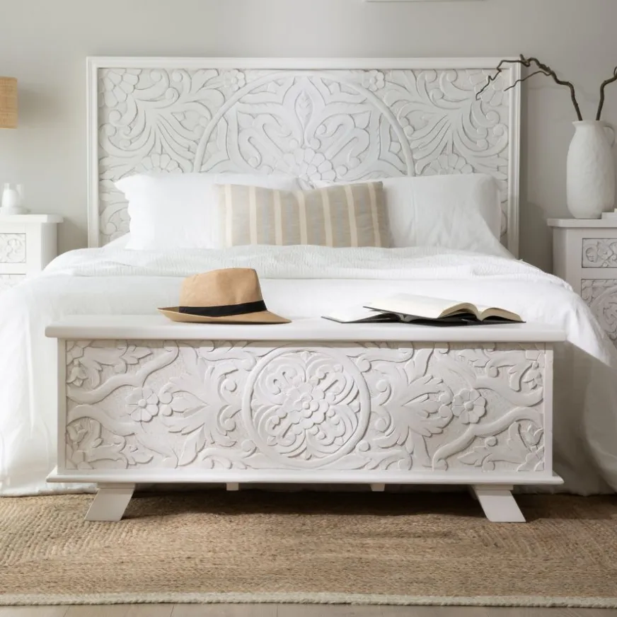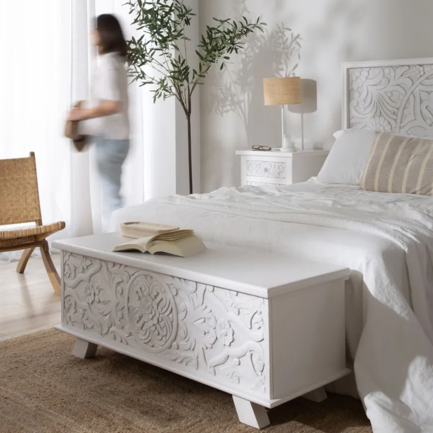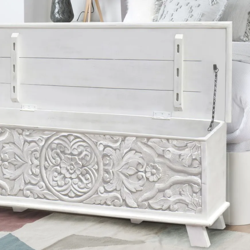 Le coffre Indira en bois blanc sculpté sera le meuble de rangement idéal pour votre chambre à coucher. Grâce à ses dimensions compactes, 120x43x45 cm, il sera parfait au pied de votre lit ou sous la fenêtre. L’élément distinctif du coffre réside dans les motifs floraux sculptés à la main qui ornent sa façade. Alors, qu’attendez-vous pour l’emmener chez vous ?