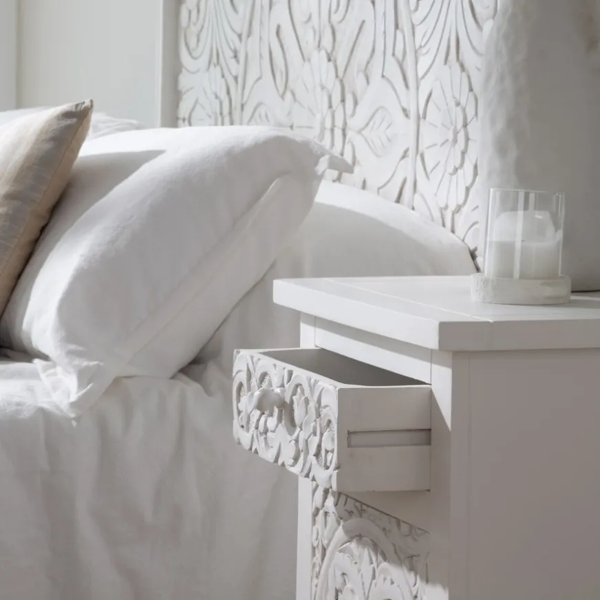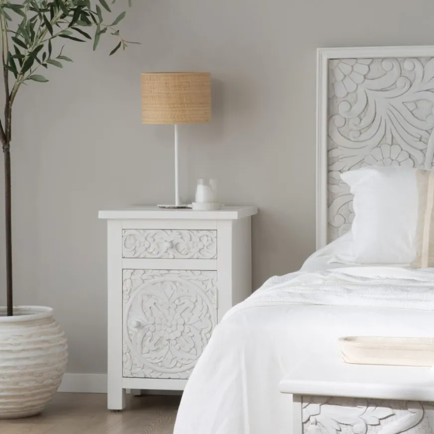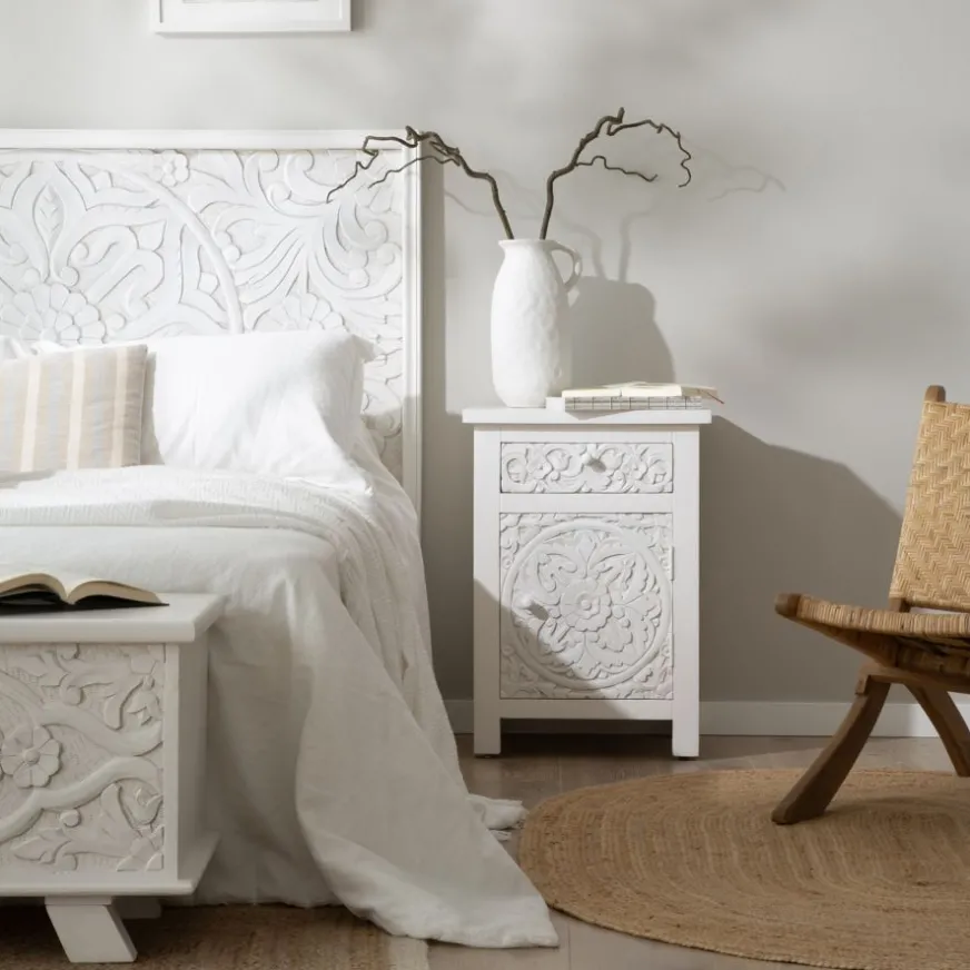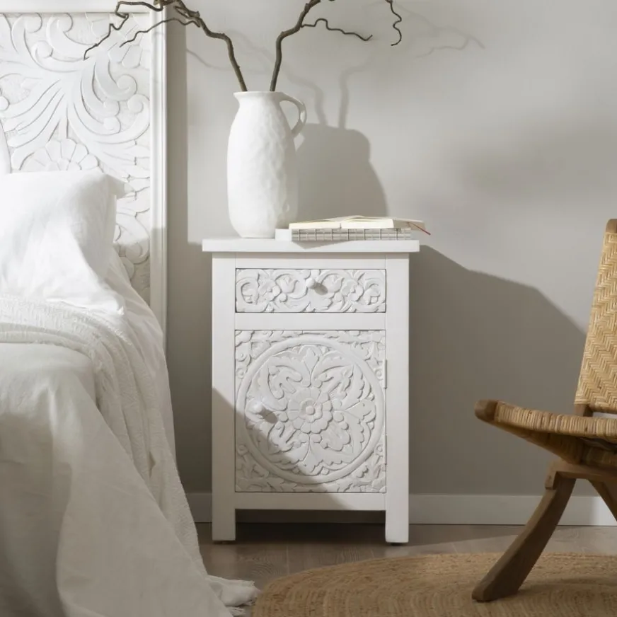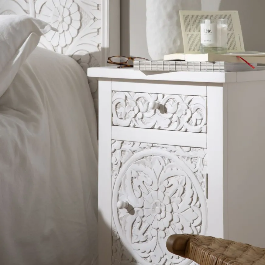 Banak Indira Table de nuit blanche en bois massif sculpté de manguier