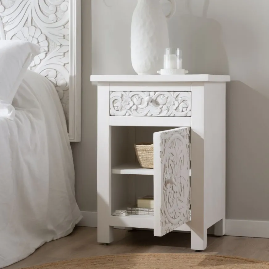 La table de chevet blanche en bois sculpté Indira est le meuble dont vous avez besoin pour gagner de l’espace de rangement près de votre lit. Avec un tiroir supérieur et une zone de rangement protégée par une porte dans la partie inférieure de la pièce, cette table de chevet de 50x40x70 cm et finie en blanc brossé devient un bijou de collectionneur, grâce aux motifs floraux sculptés à la main qui définissent la façade du meuble.