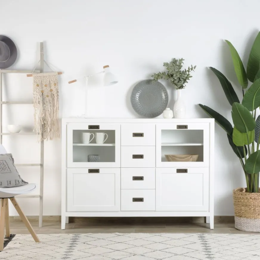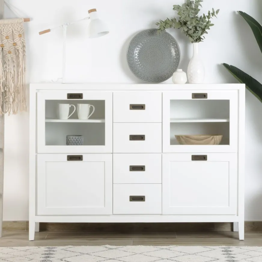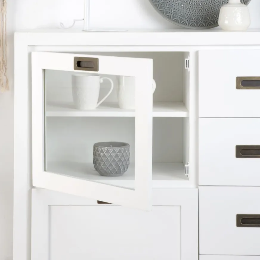 Le buffet étroit en bois Kehra de style oriental est le complément parfait pour gagner de l’espace de rangement dans notre maison sans gaspiller le moindre espace. Il dispose de 4 tiroirs identiques au centre de la pièce, tous équipés de glissières métalliques, ainsi que de 4 portes vitrées, 2 de chaque côté des tiroirs centraux. L’espace intérieur est divisé en 2 compartiments égaux par une étagère. De plus, les 2 portes supérieures sont combinées avec du verre, laissant voir les éléments qui y sont déposés. D’autre part, son design aux lignes droites et sa profondeur contenue (35 cm) lui permettent de servir de meuble d’appoint aussi bien dans notre salle à manger que dans notre entrée ou dans d’autres zones de passage.