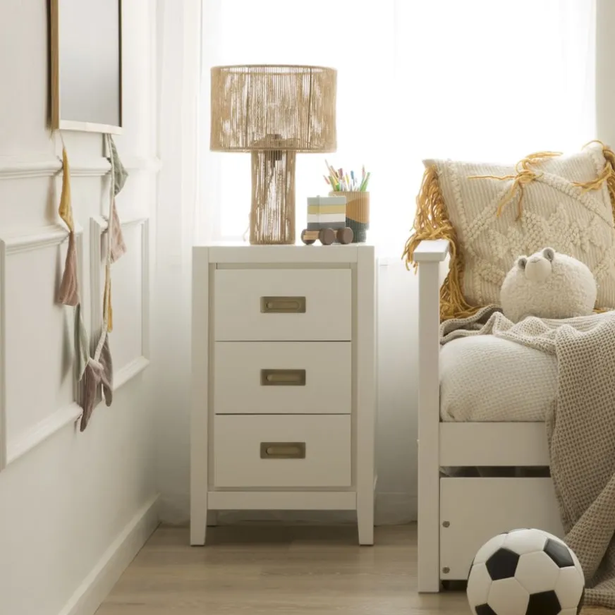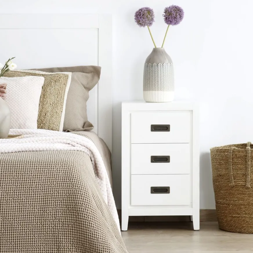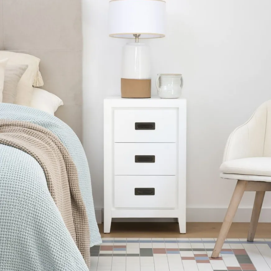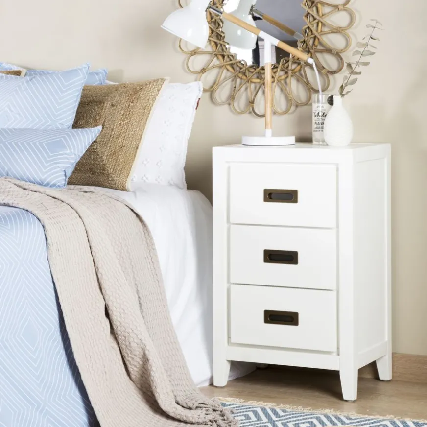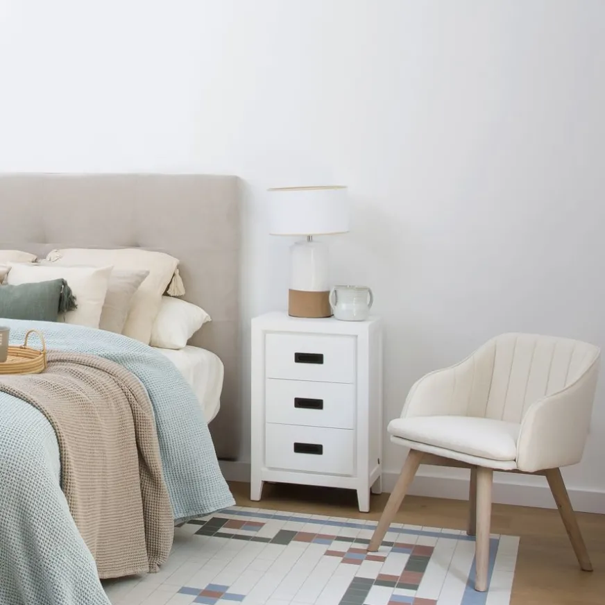 La table de chevet blanche Kehra sera indispensable dans la chambre des amateurs du style oriental. Ce modèle, aux proportions parfaites, répond à tous les critères que nous recherchons en tant que fidèle compagnon de notre tête de lit. La table de chevet dispose de trois tiroirs spacieux avec des guides métalliques, ce qui facilite grandement son utilisation. Chacun d’eux est couronné d’une poignée métallique incrustée dans sa façade. Ses pieds effilés mettent en évidence le soin minutieux apporté par notre équipe de conception à sa réalisation. Finition en blanc, cette pièce deviendra indispensable dans votre chambre aux côtés de la commode et de la chiffonnière de la même collection (KR-0102BC et KR-0103BC). Optez pour la collection Kehra et assurez-vous le succès dans l’espace le plus intime et personnel de votre maison.