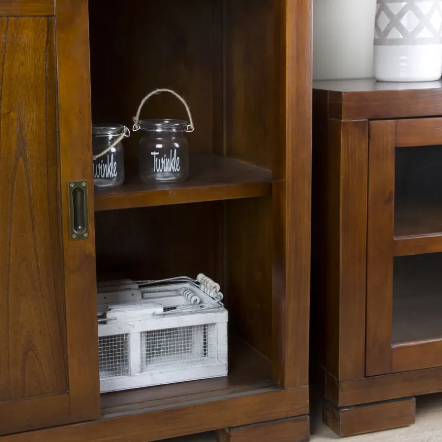 Élégante et pratique, la vitrine en bois couleur teck Kenia combine les éléments essentiels pour maximiser son utilité. Ainsi, dans sa partie supérieure, elle dispose de portes coulissantes vitrées, avec une décoration extérieure en croisillons en bois. Elle est suivie de cinq tiroirs pratiques, avec une capacité suffisante pour ranger votre linge de table et vos couverts, ainsi que de deux portes coulissantes inférieures, pour tout ce que vous souhaitez cacher. Pièce indispensable pour sa capacité et son harmonie.