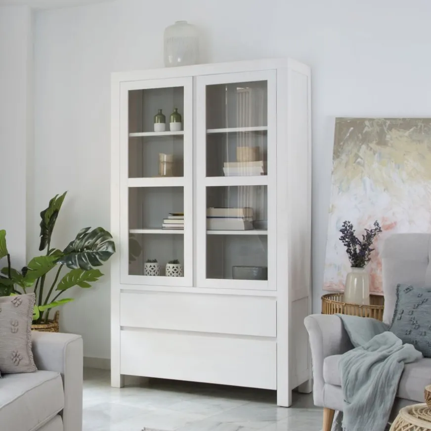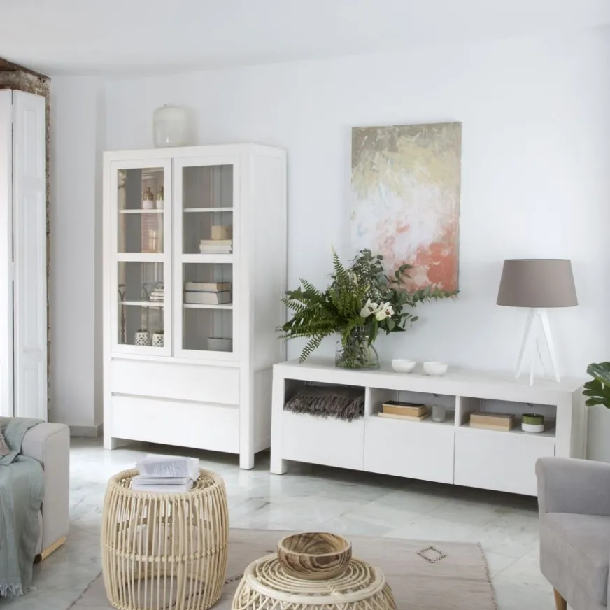 La vitrine en bois blanc Liland est le meuble de rangement parfait pour les amateurs du style minimaliste. Fabriquée en bois massif et en panneau de fibres de densité moyenne et de couleur blanche, la vitrine est composée de deux grandes portes vitrées avec des charnières métalliques qui cachent à l’intérieur un total de huit espaces de rangement indépendants. En bas, la vitrine dispose de deux grands tiroirs avec des guides métalliques, parfaits pour ranger confortablement tout ce dont vous avez besoin à l’intérieur. Les bords biseautés de ses portes et tiroirs forment les poignées intégrées de cette pièce qui ne peut pas manquer dans votre maison.