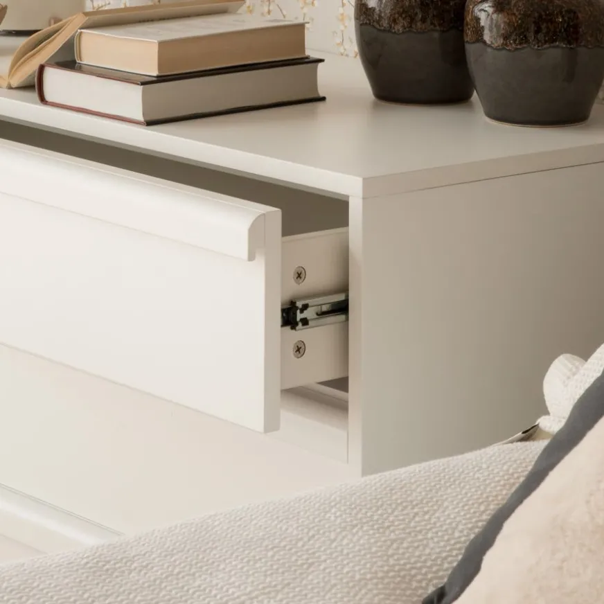 « La commode en bois blanc Margot sera un must » dans la chambre des amateurs de style vintage, grâce à sa touche rétro donnée par ses pieds tournés et sa poignée continue avec un bord arrondi. De plus, la commode dispose de trois tiroirs avec une grande capacité de rangement et avec un guide métallique, dans lesquels vous pourrez facilement ranger tout ce que vous souhaitez. » » »