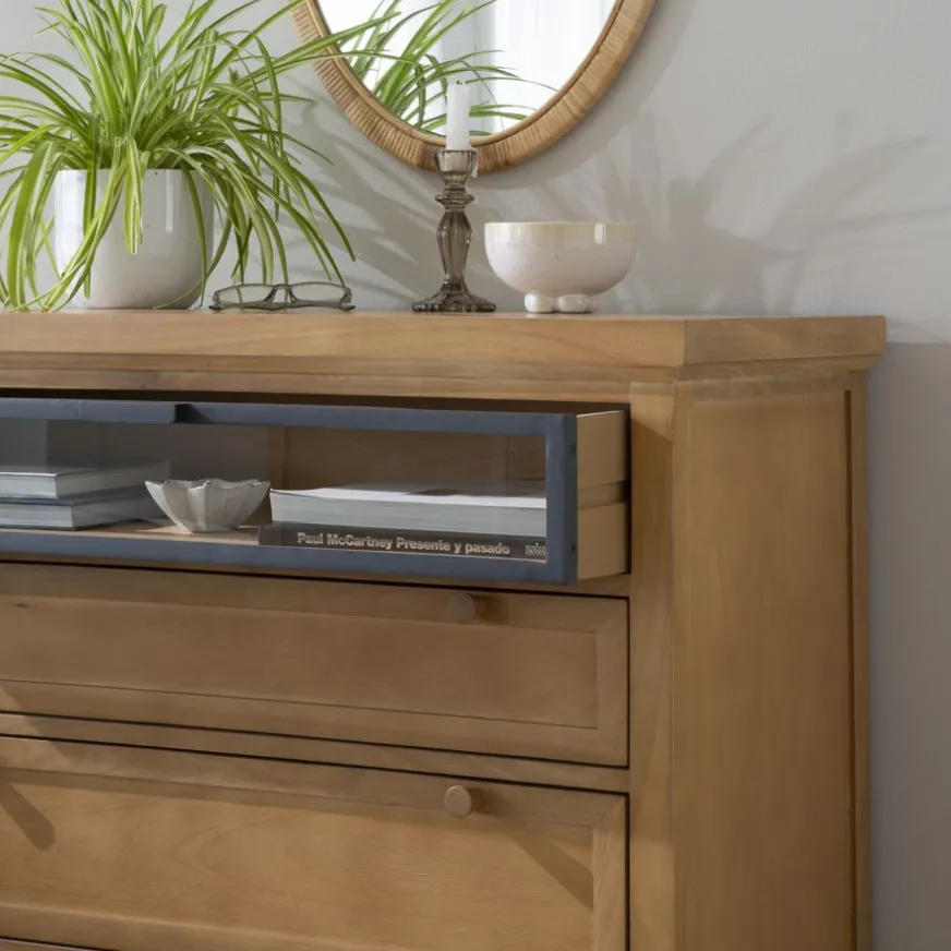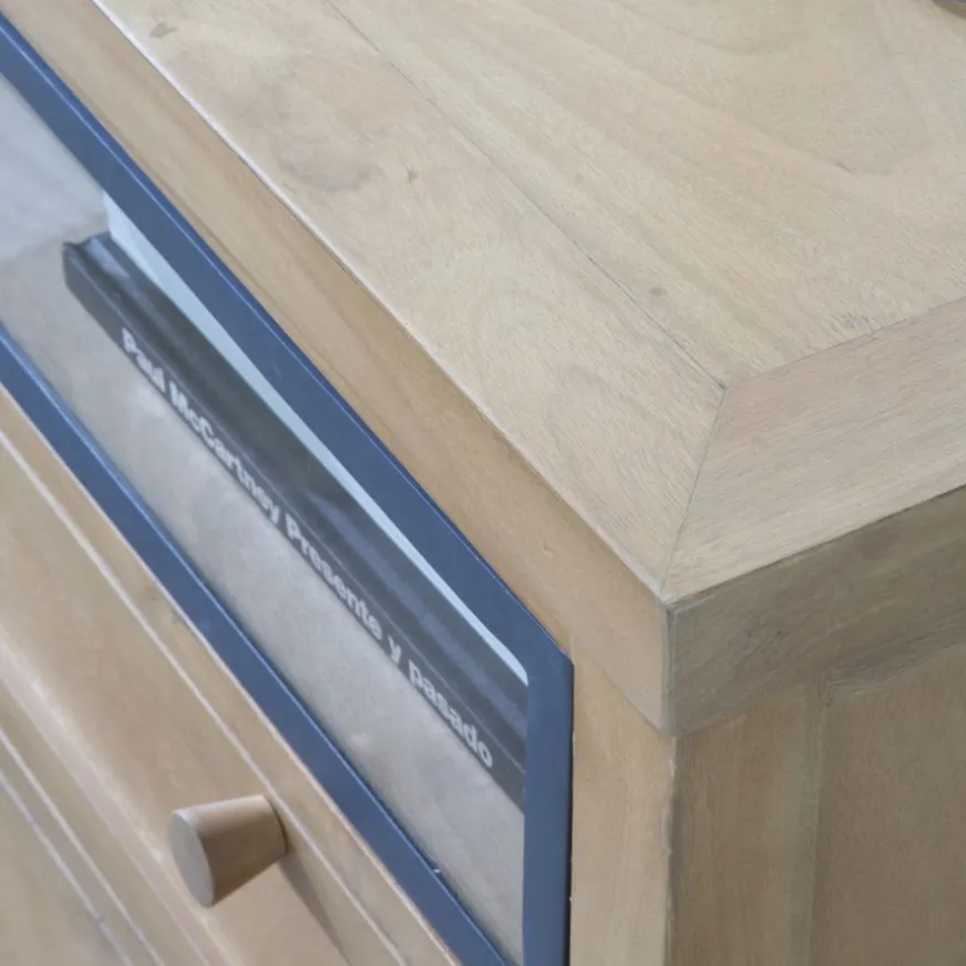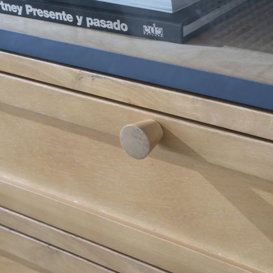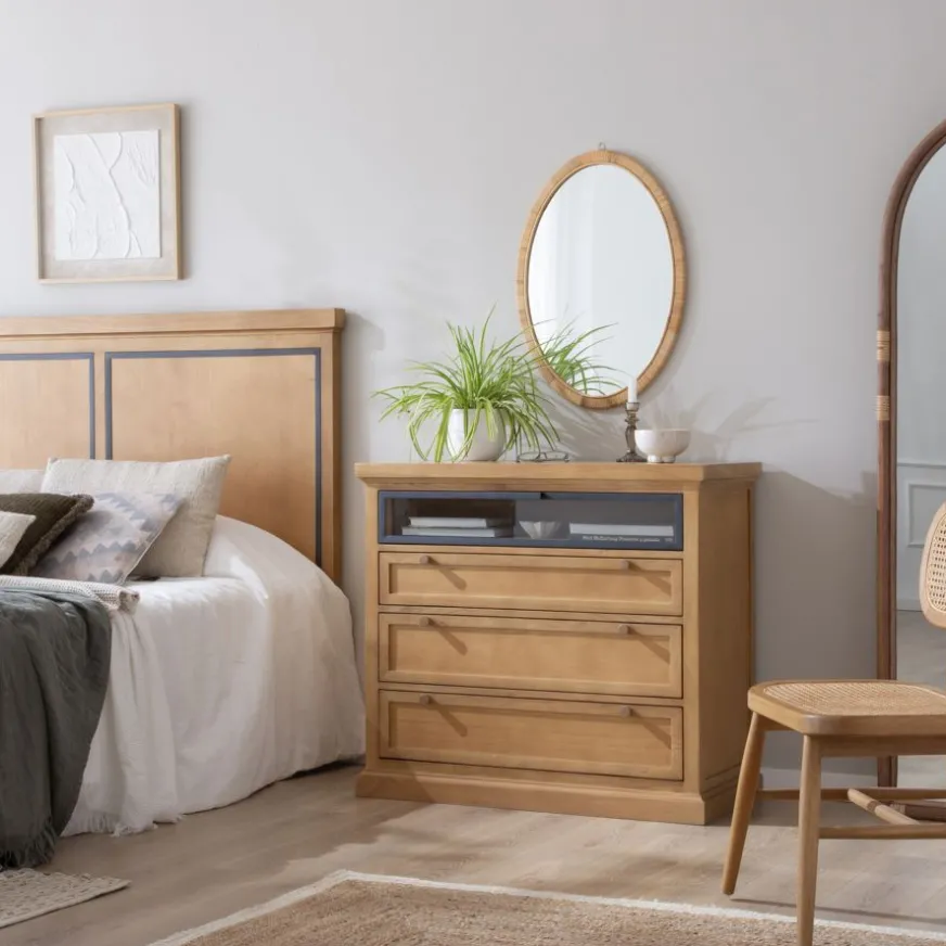 Cette commode en bois naturel a été créée pour ceux qui aiment le style rustique chic avec des touches de tendance, ajoutées à travers le métal. Ses lignes épurées, l’encadrement de chacun de ses tiroirs et les poignées en forme de bouton qui facilitent l’ouverture et la fermeture de chacun d’eux font de cette commode une pièce très élégante. De plus, l’élément distinctif par excellence de la collection est le tiroir supérieur, qui combine métal et verre dans un équilibre parfait. En termes de fonctionnalité, il offre un bon espace de rangement supplémentaire grâce à ses 4 grands tiroirs de différentes tailles. Optez pour cette commode de 97 cm de long, 45 cm de profondeur et 87 cm de hauteur et profitez d’un meuble pour toute la vie, que ce soit dans votre chambre ou dans votre hall d’entrée.