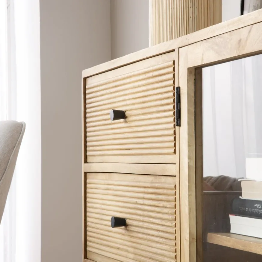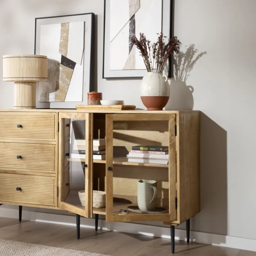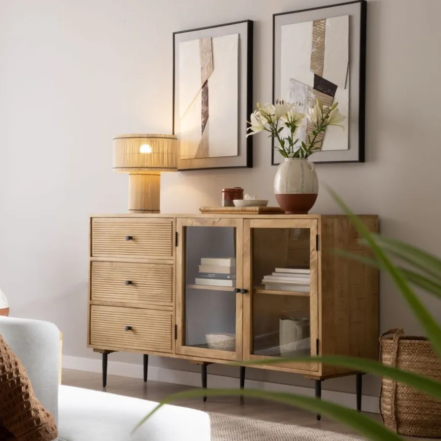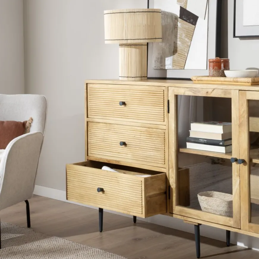 Le buffet en bois et métal Boreal de style industriel associe la finition Bahamas du bois avec des pieds et des poignées métalliques anthracite. Idéal comme meuble de rangement, le buffet Boreal dispose de trois grands tiroirs identiques, dans lesquels nous pouvons apprécier le détail du bois sculpté si caractéristique de la collection Boreal, et de deux portes vitrées qui abritent à l’intérieur un grand espace de rangement divisé par une étagère. Grâce à la hauteur de ses pieds, le buffet Boreal permet le passage de l’aspirateur robot, facilitant ainsi grandement le nettoyage sous le meuble.