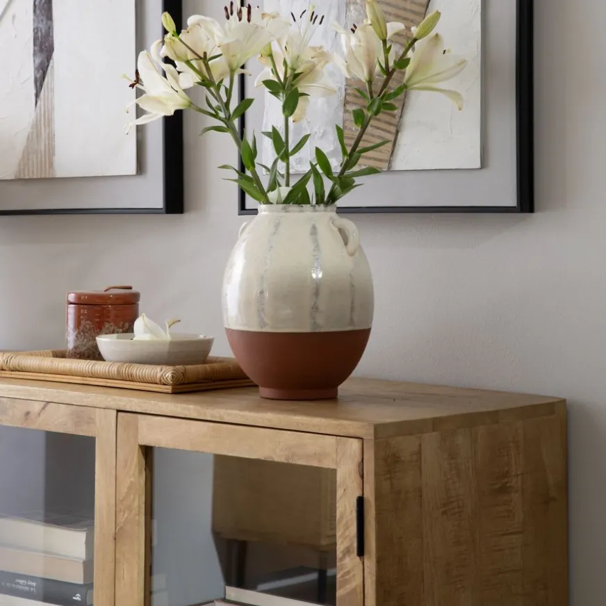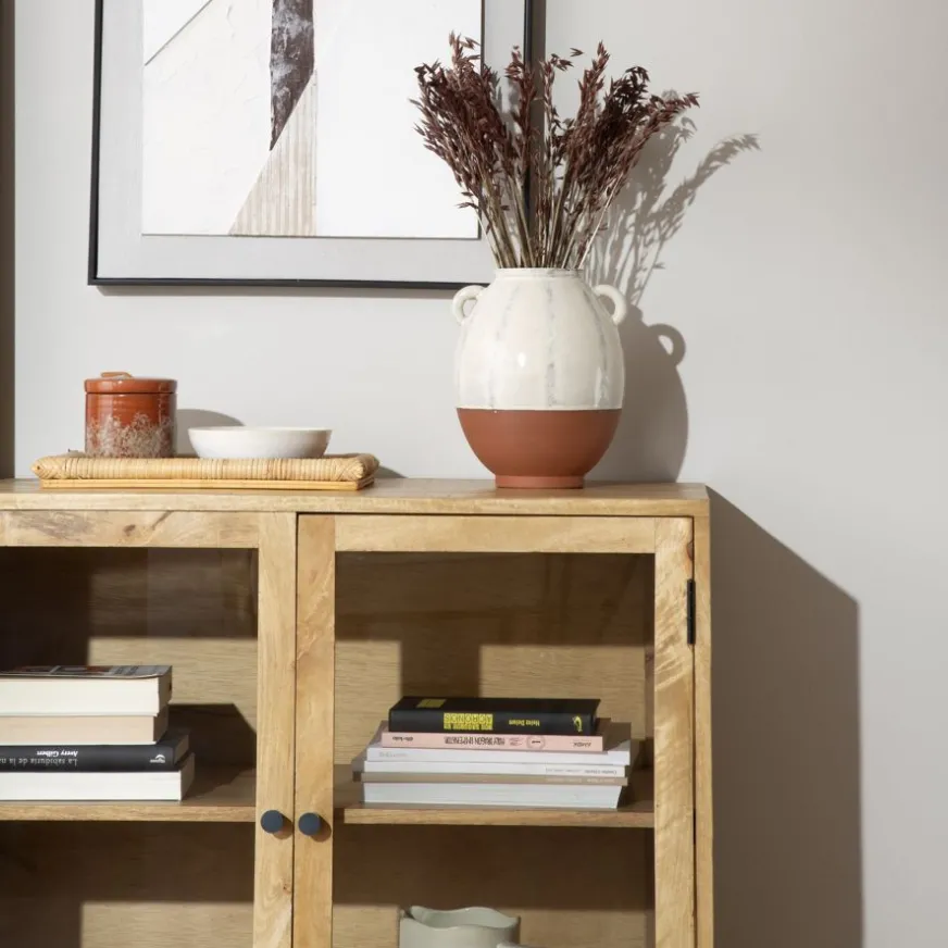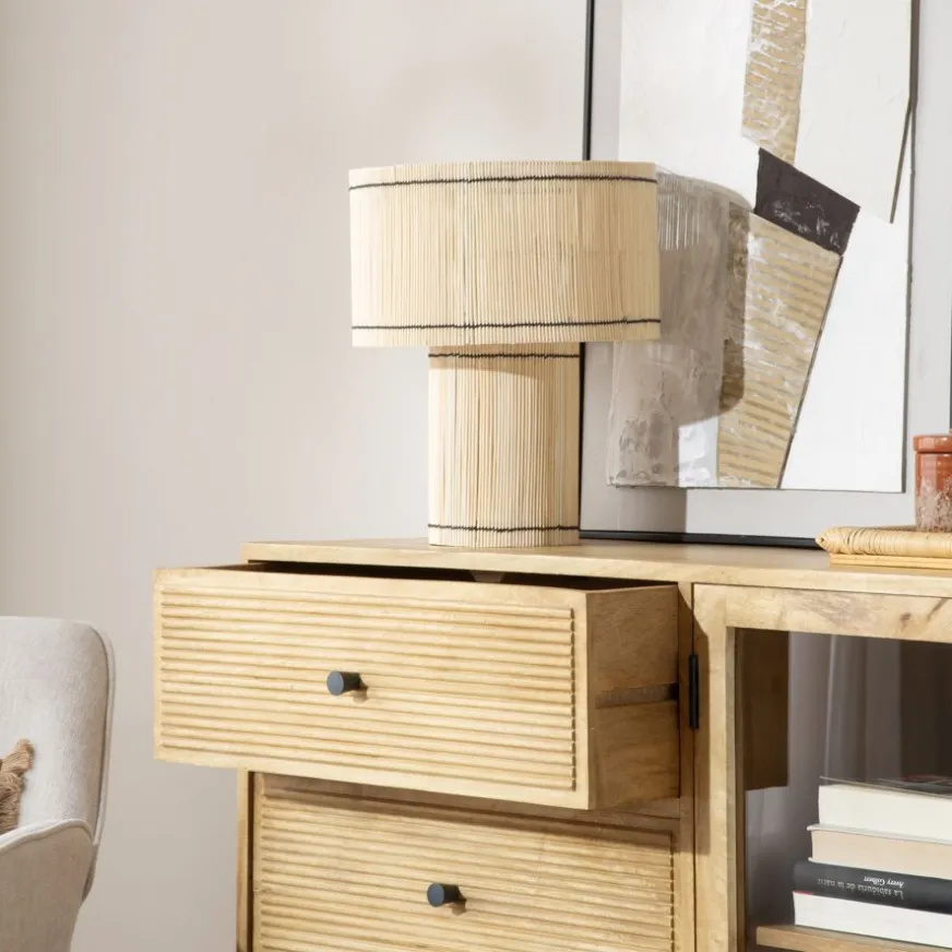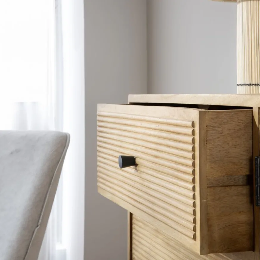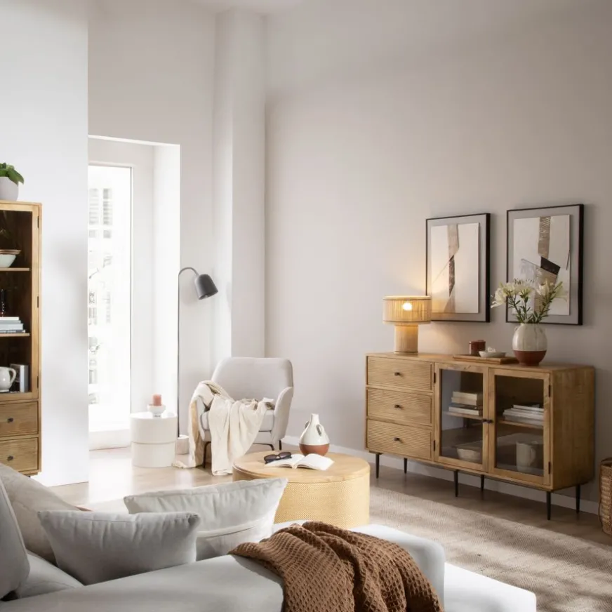 Le buffet en bois et métal Boreal de style industriel associe la finition Bahamas du bois avec des pieds et des poignées métalliques anthracite. Idéal comme meuble de rangement, le buffet Boreal dispose de trois grands tiroirs identiques, dans lesquels nous pouvons apprécier le détail du bois sculpté si caractéristique de la collection Boreal, et de deux portes vitrées qui abritent à l’intérieur un grand espace de rangement divisé par une étagère. Grâce à la hauteur de ses pieds, le buffet Boreal permet le passage de l’aspirateur robot, facilitant ainsi grandement le nettoyage sous le meuble.