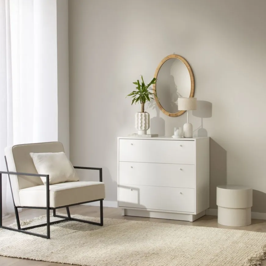 Ajoutez une touche d’élégance nordique à votre chambre avec la commode Halti. Dans une couleur blanche mate sophistiquée, cette commode de style nordique offre un design propre et fonctionnel. Avec trois tiroirs équipés de guides métalliques, elle offre un espace de rangement généreux pour vos affaires. Parfaite pour compléter tout style de décoration, la commode Halti est idéale pour ceux qui cherchent à allier style et praticité dans leur maison.