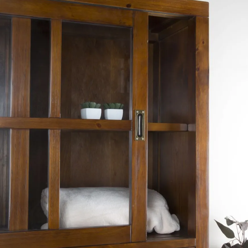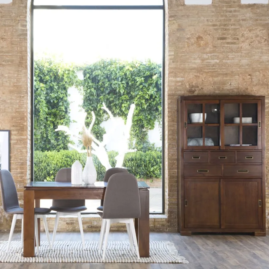 Élégante et pratique, la vitrine en bois couleur teck Kenia combine les éléments essentiels pour maximiser son utilité. Ainsi, dans sa partie supérieure, elle dispose de portes coulissantes vitrées, avec une décoration extérieure en croisillons en bois. Elle est suivie de cinq tiroirs pratiques, avec une capacité suffisante pour ranger votre linge de table et vos couverts, ainsi que de deux portes coulissantes inférieures, pour tout ce que vous souhaitez cacher. Pièce indispensable pour sa capacité et son harmonie.