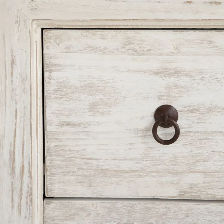 Son fini Shabby white avec un effet vieilli tente de simuler l’usure naturelle d’un meuble ancien, étant plus intense dans la partie inférieure du meuble que dans la partie supérieure.