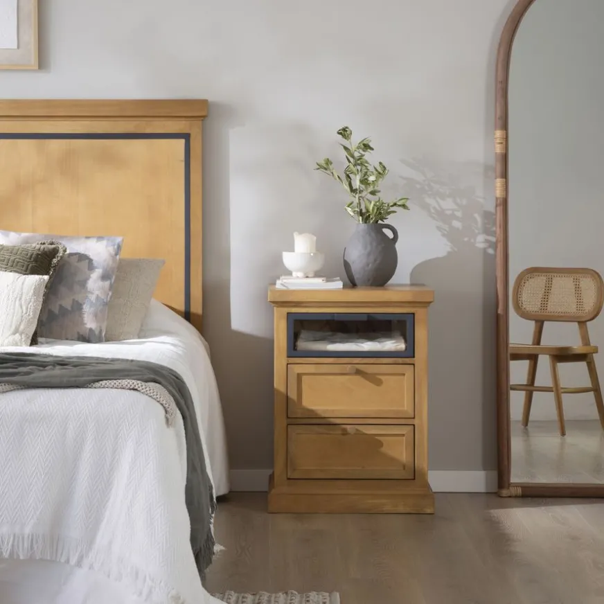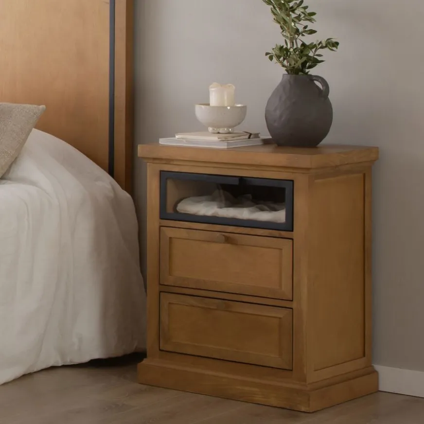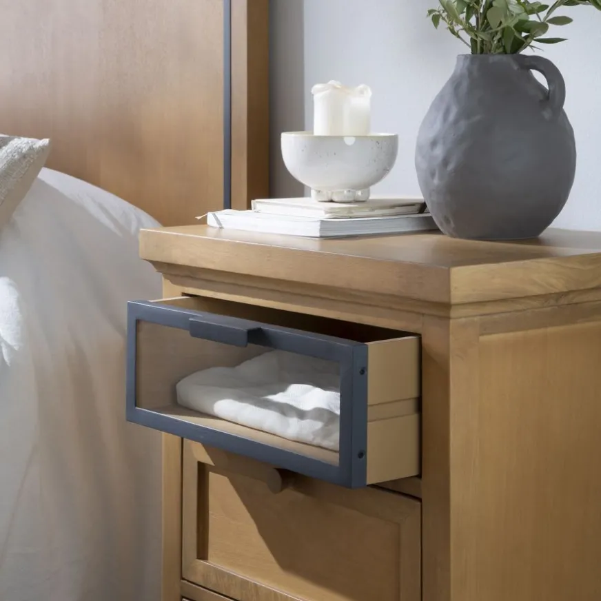 Dis oui au bois naturel avec cette table de chevet, si tu aimes le style rustique chic avec certaines touches tendance. À travers le métal qui définit le périmètre et la poignée du tiroir supérieur ainsi que les lignes épurées de son design, cette table de chevet devient l’une de nos propositions les plus élégantes. De plus, le fait que le devant du tiroir supérieur soit en verre crée un jeu visuel très attrayant. En termes de fonctionnalité, elle t’offrira un bon espace de rangement supplémentaire à côté de ton lit, grâce à ses 3 tiroirs. Opte pour cette table de chevet de 52 cm de long, 40 cm de profondeur et 69 cm de hauteur et profite d’un meuble qui ne laissera personne indifférent.